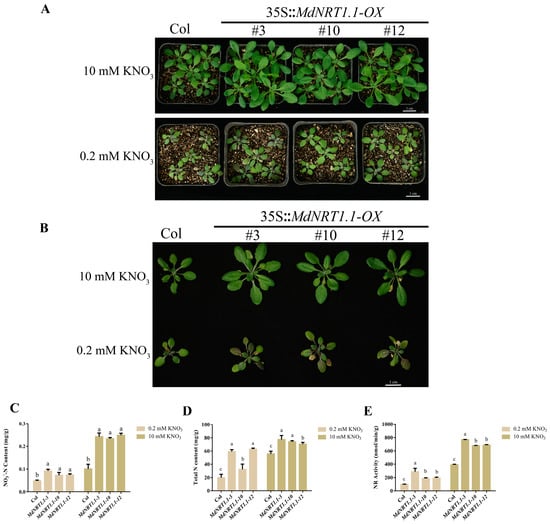 To further explore the function of MdNRT1.1 in regulating nitrate use, MdNRT1.1 was ectopically transformed into Arabidopsis, and 3 overexpression lines with high expression were obtained from 12 overexpression lines (#3, #10, and #12) (Figure S3). Then, MdNRT1.1-OX and Col were treated in 1/2 MS medium containing 0.2 mM KNO3 or 10 mM KNO3 for 30 days (Figure 3A). Compared with Col, the MdNRT1.1-OX overexpression lines had a higher biomass (Figure 3A,B), following the higher NO3−-N and total nitrogen content (Figure 3C,D). MdNRT1.1 overexpression led to higher nitrate reductase (NR) activity (Figure 3E). These results suggested that MdNRT1.1 promoted nitrate assimilation and utilization and then promoted plant growth and development.