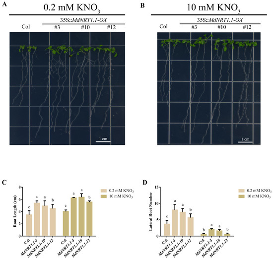 Effect of MdNRT1.1-OX in regulating root development. (A) Col and three MdNRT1.1 Arabidopsis lines on 1/2 MS medium supplement with 0.2 mM KNO3. (B) Col and three MdNRT1.1 Arabidopsis lines on 1/2 MS medium supplement with 10 mM KNO3. (C,D) Data related to the primary root lengths (C) and lateral root number (D) in Col and transgenic lines. Bars represent the mean ± SD (n = 3). Different letters above the bars indicate significant differences using the LSD test (p < 0.05).