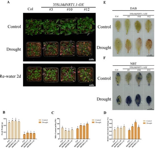 When plants are exposed to stress, intracellular reactive oxygen metabolism is disturbed and reactive oxygen species (ROS) accumulate. Hydrogen peroxide is the main ROS produced in plants, and staining samples using NBT and DAB can analyze the status of reactive oxygen species accumulation during abiotic stress in experimental materials. Before the drought treatment, there was no obvious difference between Col and MdNRT1.1 transgenic strains. However, after drought treatment, the MdNRT1.1 transgenic strain stained darker than Col. It was verified that MdNRT1.1 plants produce more ROS than Col (Figure 5E,F). In general, these results indicated that ROS accumulation in MdNRT1.1-OX plants was much higher than that in Col plants during drought conditions.