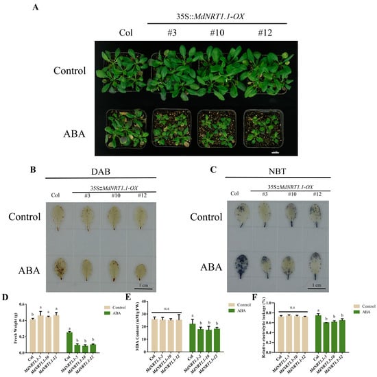 Before ABA treatment, neither DAB nor NBT staining of Col and MdNRT1.1 transgenic lines revealed any significant changes (Figure 7B,C). After ABA treatment, staining of the MdNRT1.1 overexpression lines revealed that the transgenic MdNRT1.1-OX lines staining region had a smaller surface area than Col (Figure 7B,C). These results indicated that ABA inhibited the growth of MdNRT1.1 transgenic Arabidopsis but induces lower ROS generation in the plants. This scenario was consistent with the prior research that ABA inhibits the capacity of MdNRT1.1 to absorb or transport nitrate, but more research is required [32].