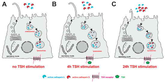 - Linke, M.; Jordans, S.; Mach, L.; Herzog, V.; Brix, K. Thyroid Stimulating Hormone Upregulates Secretion of Cathepsin B from Thyroid Epithelial Cells. Biol. Chem. 2002, 383, 773–784. [Google Scholar] [CrossRef]