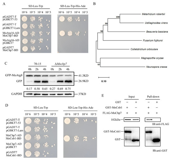 Identification of MoCbp7. (A) Yeast two-hybrid assay of MoCbp7 and MoAtg16 interaction. (B) Phylogenetic analysis of MoCbp7 and homologues of MoCbp7 in several filamentous fungi. MEGA11 was used to construct the phylogenetic tree using the neighbor-joining method with 1000 bootstrap replicates and the Poisson model. The filamentous fungi can be found in GeneBank with the following accession numbers: XP_003710568.1 (M. oryzae); XP_008601432.1 (Beauveria bassiana); XP_023433455.1 (Fusarium fujikuroi); XP _007819772.2 (Metarhizium robertsii); XP_956171.2 (Neurospora crassa); TDZ23940.1 (Colletotrichum orbiculare); and XP_042999839.1(Ustilaginoidea virens). (C) Autophagy levels of the wild-type 70-15 and ΔMocbp7 in liquid CM and SD-N induction were detected by examining the degradation level of GFP-MoAtg8. (D) Yeast two-hybrid assay for the interaction of MoCbp7 and MoCnb1. pGBKT7-53 and pGADT7-T were used as positive controls. pGBKT7-Lam and pGADT7-T were used as negative controls. (E) The pulldown assay for the detection of the interaction of MoCbp7 and MoCnb1.