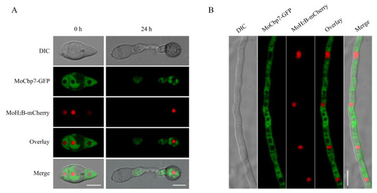 MoCbp7 is localized in the cytoplasm of M. oryzae. (A) Fluorescence signals of MoCbp7-GFP and MoH2B-mCherry at conidial and appressorial stages; bar, 10 μm. (B) Fluorescence signals of MoCbp7-GFP and MoH2B-mCherry at mycelial stage; bar, 10 μm.