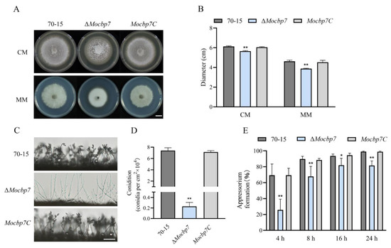 MoCbp7 is essential for asexual growth, sporulation, and appressorium formation. (A) Colony morphology of wild-type 70-15, ΔMocbp7, and Mocbp7C was photographed after 9 dpi at 25 °C; bar, 1 cm. (B) Colony diameters of wild-type 70-15, ΔMocbp7, and Mocbp7C. (C) Conidiophore morphology of wild-type 70-15, ΔMocbp7, and Mocbp7C after 24 hpi at 28 °C; bar, 100 μm. (D) Conidia numbers of 70-15, ΔMocbp7, and Mocbp7C after 9 dpi. (E) Appressorium formation rates of wild-type 70-15, ΔMocbp7, and Mocbp7C. The appressoria were induced on hydrophobic coverslips for 4 h, 8 h, 16 h, and 24 h. Statistical differences were analyzed by GraphPad Prism 8.0 via Tukey’s test (* p < 0.05, ** p < 0.01).