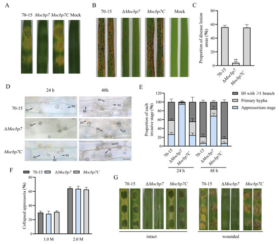 To determine the effect of MoCbp7 on the virulence of M. oryzae, as shown in Figure 5A, the mycelium plugs of wild-type 70-15, ΔMocbp7, and Mocbp7C were inoculated on detached barley leaves and photographed after 4 dpi. In contrast to the barley leaves inoculated with wild-type 70-15 and Mocbp7C, which showed typical severe disease symptoms, the barley leaves inoculated with the ΔMocbp7 mutant showed little visible damage. Then, conidial suspensions (5 × 104 conidia/mL) were acquired for the subsequent spray infection assays in order to further validate whether the defect in virulence of the ΔMocbp7 mutant was exclusively caused by the defect in conidiation. Similarly, in the spray infection assays with 2-week-old rice seedlings (CO-39), numerous typical spindle-shaped lesions were observed on leaves sprayed with the conidia of wild-type 70-15 or the complementary strain Mocbp7C, but only slightly limited necrosis was observed in the ΔMocbp7 mutant after 6 dpi (Figure 5B,C). Next, the invasive stage of the appressorium was classified after observation of the infection of detached barley leaves under an electron microscope (Figure 5D,E). At 24 hpi, ΔMocbp7 mutant barely developed invasive hypha (IH), and less than 5% of the appressoria had developed penetration pegs. In contrast, 72.67% of the appressoria in the wild-type 70-15 produced IH, of which 41.25% had one or more branches. At 48 hpi, nearly 95% of the appressoria in wild-type 70-15 and Mocbp7C had penetrated the host cuticle and produced IH with multiple branches that spread to adjacent cells. This is compared to 68.56% of the ΔMocbp7 mutant appressoria, which were still in the non-infected stage, and only 16.33% of the IH could form branches but did not develop to adjacent cells, which indicated the severely impaired invasion capacity of appressoria in the ΔMocbp7 mutant.