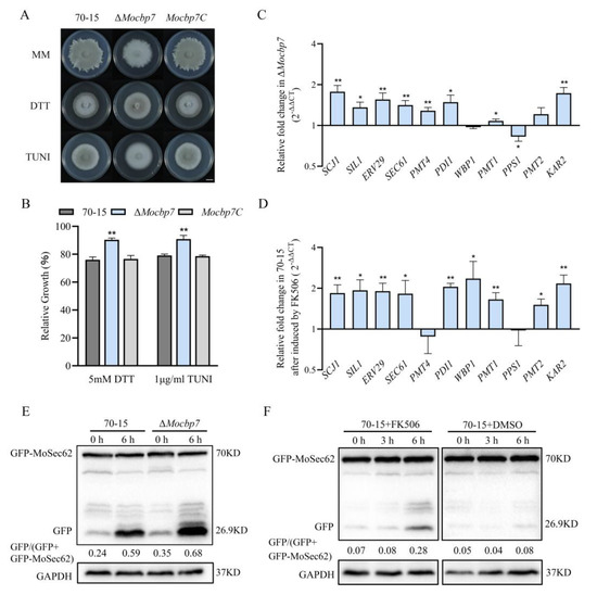 The ER, one of the major organelles for storing calcium ions, is subject to precise concentration regulation [39]. Numerous studies have shown that the calcium signaling pathway participates in ER stress adaptation, whereas a reduction in the calcium content in the ER induces ER stress [12]. To better comprehend the relationship between the calcium signaling system and ER, two ER stress inducers, dithiothreitol (DTT) and tunicamycin (TUNI), were added to the MM media to test the sensitivity of the ΔMocbp7 mutant. In MM media supplemented with 5 mM DTT or 1 g/mL TUNI, the relative growth rate of the ΔMocbp7 mutant was higher than that of wild-type 70-15 and Mocbp7C. (Figure 6A,B).