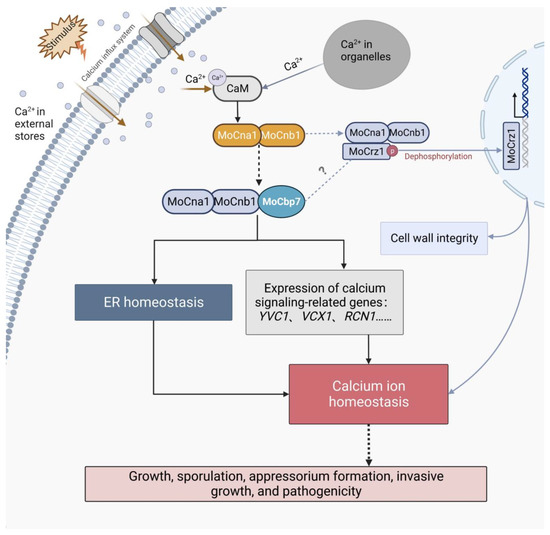However, the underlying regulatory mechanisms of the calcium signaling pathway remain largely unknown in M. oryzae. Many calcium-signal-related proteins are involved in the regulation of M. oryzae virulence, including genes encoding calcineurin, calcineurin A subunit (MoCna1), and calcineurin B subunit (MoCnb1). MoCnb1 is especially important in regulating the virulence of M. oryzae [36]. Here, we reported a novel gene, MGG_16441, which encodes a protein that was shown to interact with MoCnb1; we named it MoCbp7 (calcineurin-binding protein). MoCbp7 was localized in the cytoplasm and participated in the calcium signaling pathway, was involved in calcium ion homeostasis and ER homeostasis, and was found to be essential for growth, conidiation, appressorium formation, and virulence.