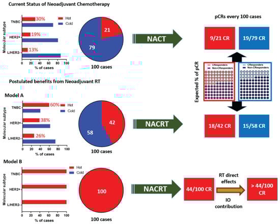 Schematic presentation of the speculated benefit of radiovaccination expected from the combination of neoadjuvant radiotherapy (RT) with neoadjuvant chemotherapy (NACT). The model is based on indicative percentages (with approximation) reported in the study by Denkert et al. [14], where high tumor-infiltrating lymphocyte (TIL) density was noted in 13%, 19%, and 30% of luminal HER2−-(L/HER2−), HER2+, and TNBC, respectively, which account for an average of 21 out of 100 BCs with high TIL density. The pathologic complete response (pCR) rates reported were 44% in “hot” (high TIL density) and 25% in “cold” (low-intermediate TIL density) BCs, regardless of the molecular subtype. We assumed a doubling of the immunologically “hot” tumors due to irradiation to provide the Model A (Model A; 42/100 BCs). Following this assumption, neoadjuvant chemoradiotherapy (NACRT) could increase the overall number of patients with pCR by 5 (33 vs. 28). Total transformation of tumors by RT to the “hot” state (100/100 BCs) would provide a maximum benefit estimated to 44 pCRs (Model B), thus 16 additional patients in every 100 would reach pCR (44 vs. 28). This increase is solely attributed to the radiovaccination effects of RT. The benefit from the direct effect of RT on cancer cell killing further enhances the number of expected pCRs (in both “hot” and “cold” tumors). An additional benefit from immunotherapy (IO) in patients with immunologically activated tumors is also anticipated, which could have an impact in pCRs and survival of patients.
