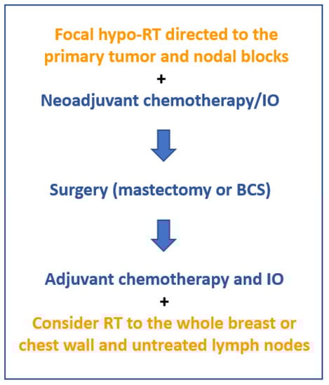 A treatment algorithm incorporating neoadjuvant RT for BC. In order to tap into the radiovaccination properties of irradiation and enhance the efficacy of chemotherapy and IO, neoadjuvant ablative or sub-ablative doses of RT should be targeted to the breast tumor and potential co-existing regional nodal blocks, before or concurrently with chemotherapy and IO. Adjuvant RT could be considered for the whole breast (without a tumor bed boost) or chest wall and previously untreated lymph nodes. (abbreviations: RT = radiotherapy; hypo- = hypofractionated; IO = immunotherapy; BCS = breast-conserving surgery).