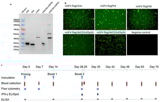 Antigen expression, immunization design and sample collection schedules. (a). Expression of the Flag-targeted ASFV structure proteins p30, p54, CD2v, the N-terminal ubiquitin-fused CD2vEDp30 and CD2vEDp54 proteins expressed in BHK cells was detected by Western blot with an anti-ASFV serum. (b). Infection of BHK cells with recombinant replicon particles reSFV-flagCD2v, reSFV-flagP54, reSFV-flagP30, reSFV-flagubiCD2vEDP30 and reSFV-flagubiCD2vEDP54, respectively, and the expression of flagCD2v, P54, P30, flagubiCD2vEDP30 and flagubiCD2vEDP54 was detected by immunostaining with and anti-ASFV serum and photographed with fluorescent microscopy. (c). A schematic diagram illustrating the schedules of antigen inoculationand sample collection.