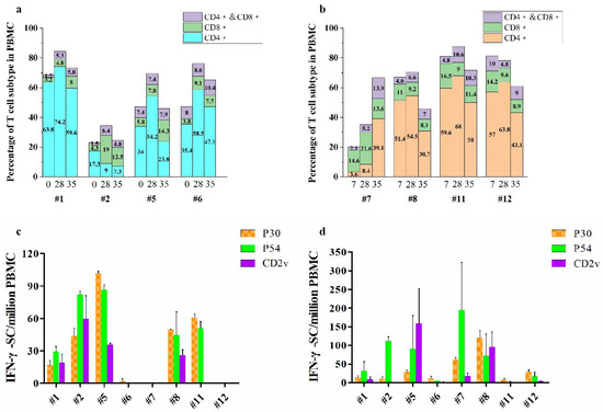 ELISpot analysis, an enzyme-linked ImmunoSpot assay, was then used to measure the IFN-γ-secreting cells which is important in regulation of the innate and adaptive immunity by antigen stimulation. IFN-γ responses in vitro revealed a correlation with the degree of cross-protection against heterologous ASFV challenge []. PBMCs were stimulated by co-incubation with purified p30, p54, and CD2v proteins, respectively, and IFN-γ secreting cells were scored with an ELISpot reader, showing various levels of IFN-γ secreting cells after two boosts. A moderate induction (2-87 IFN-γ secreting cells per 1 million PBMCs) was elicited in #1, #2, #5, #8, and #11 pigs on day 28 with cognate ligands (Figure 2c), and a more diverse level of the induction (2–200 IFN-γ secreting cells per 1 million PBMCs) was detected in all pigs on day 35 (Figure 2d). The fact that IFN-γ secreting cells were detected in #7 and #12 pigs only on day 35 suggests the requirement for a second boost in some recipients (Figure 2c,d).