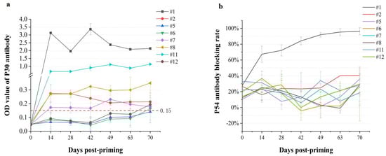 The anti-p30 specific antibody levels in serum samples were measured using an ASFV Sandwich ELISA kit, revealing a high level of anti-p30 response in #1 pig just 14 days post-priming (Figure 3a). The antibody level in this pig reached the peak in 2 weeks post-second boost and decreased slowly but remained at a relatively high level throughout the duration of the experiment (Figure 3a). A relatively high antibody induction was detected in the #11 pig from day 14 and steadily increased during the whole observation period, although the level was much lower than that in the #1 pig (Figure 3a). Other antibody-positive pigs included #2, #7, and #8, but the titers were just above the negative control (Figure 3a). It was uncertain if these levels of reaction would provide significant protection against ASFV. Meanwhile, determination of the anti-p54 response by using a competitive ELISA assay showed a 65–96% inhibition in #1 pig from day14 to 70, but other pigs showed less than 50% inhibition (Figure 3b), suggesting that the anti-p54 response was efficiently induced in pig #1 only. Taken together, these results demonstrate that specific humoral response was elicited in 5 out of the 8 immunized pigs, and the earliest date for positive anti-p30 detection was at day 14 post-priming.