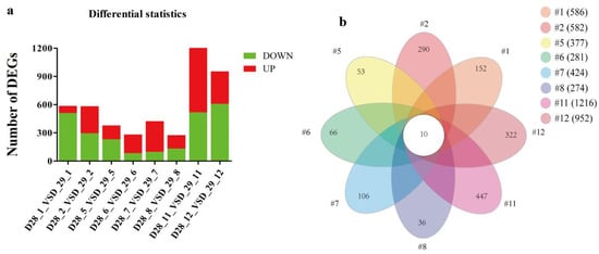 DEGs distribution in vaccinated pigs. (a). Profiles of deferentially expressed genes (DEGs) on day 28 versus day 29 from each vaccinated pig were presented. Counts for up-regulated DEGs are marked in red and down-regulated DEGs in green. (b). DEG counts for each individual pigs and overly shared DEGs in the immune system were analyzed by Venn and presented.