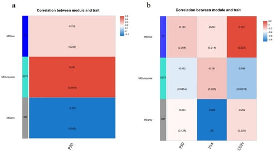 Correlation between DEGs and the trait by WGCNA. (a). Correlation between gene clusters and the anti-p30 induction trait. The red module classified in the MEturquoise gene cluster represents average correlation value (0.491) and p value (0.0148), the pink module classified in the MEblue gene cluster represents correlation value (0.255) and p value (0.229), and the MEgrey gene cluster contains non-correlated genes. (b). Correlation between gene clusters and the ELISpot count trait. Modules classified in the MEturquoise gene cluster include the light blue module with the correlation value −0.546 and p value 0.00578 to genes responding to CD2v-stimulated IFNγ-SC counts, the green module with the correlation value −0.412 and p value 0.0454 to genes responding to p30-stimulated IFNγ-SC counts and the pink one with the average correlation value −0.181 and p value 0.397 to genes responding to p54-IFNγ-SC counts. Modules classified in the MEblue gene cluster represents a relative low correlation value and large p value (>0.05), and MEgrey contains non-correlated genes. The total DEGs in individual pigs are shown in bracket.