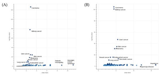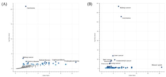 Enrichment analysis of Jensen’s disease entities performed on a list of 115 genes involved in 61 interactions with a survival significance under 0.05 among the top 1000 epistatic interactions (A), and a second list of 1220 genes involved in all top 1000 epistatic interactions (B) in LUAD. The axes x and y are the odds ratios and p-values of the disease enrichment, respectively. The entity Carcinoma describes a family of diseases characterized by abnormal proliferation of epithelial cells.