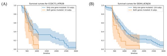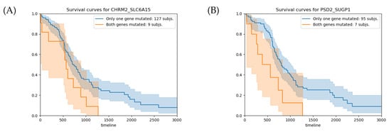 The survival analysis for the CHRM2-SLC6A15 gene pair shows that the subjects with RGPMs have 137 fewer days of survival on average than the subjects with BSGMs (Figure 5A). This difference in the overall survival time corresponds to a p-value of . For the PSD2–SUGP1 gene pair, the average overall survival time difference between the patients with RGPMs and those with BSGM is 421 days (Figure 5B), which corresponds to a p-value of . Although these p-values are lower than 0.05, they do not pass the control for the multiple testing hypothesis (q-value ).