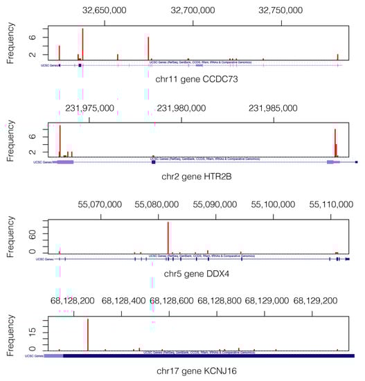 Mutation landscape in genes CCDC73, HTR2B, DDX4, and KCNJ16. Only the VAPs that pass the filters are shown. We can see where the actual VAP positions in each gene are. The gene structures are shown below each figure in a blue axis [31]. Mutations of gene KCNJ16 are in the short range of 1.2 Kb, which explains why the depicted gene structure corresponds exclusively to the exonic region.