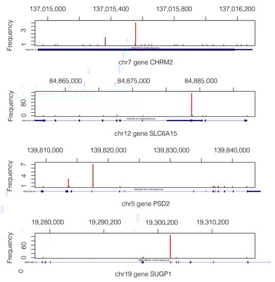 Figure 6 shows the VAP positions that passed the filters and generate the mutation of the pair of genes CHRM2-SLC6A15) and PSD2-SUGP1.
