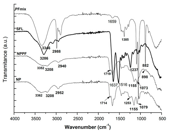 FTİR spectra of nanoparticles of silk fibroin loaded and unloaded with polyphenol mixture: SFL—silk fibroin lyophilized; NP—unloaded nanoparticles based of silk fibroin; NPPF—polyphenols loaded silk fibroin nanoparticles; PFmix—polyphenolic mixture.