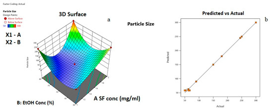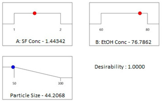 From Figure 4a, it can be observed that both silk fibroin and ethanol solution concentration affected the average particle size. For instance, at 60% EtOH concentration, when silk fibroin concentration increased, the average particle size was changed from 50 to 250 nm. At a relatively higher EtOH concentration of 80%, when silk fibroin concentration increased from 1 to 1.5 mg/mL, the average particle size first decreased from 250 to 100 nm, then increased to 300 nm with the increase of silk fibroin concentration to 2 mg/mL. At a lower silk fibroin concentration of 1 mg/mL, average particle size increased from 60 to 250 nm with the increase of EtOH concentration from 60 to 80%. On the other hand, at relatively higher silk fibroin concentrations (2 mg/mL), the increase in EtOH concentration from 60 to 70% caused average particle size to decrease from 250 to 100 nm; then, an increase in EtOH concentration to 80 % resulted in particles with an average size of 300 nm. The minimum average particle size can be obtained at the center point of the experimental design. From Figure 4b, it can be understood that a good fit between predicted values and the experimental data points occurred. In Figure 5, the desirability ramp for optimization for the minimum particle size is given.