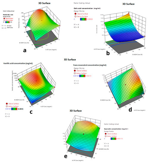 Three-dimensional graphs for the maximum and minimum values of the response variables: (a) Particle size (b) Gallic acid (c) Vanillic acid (d) Trans-resveratrol (e) Quercetin concentrations.