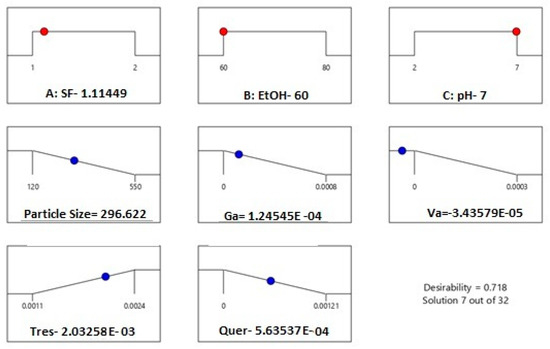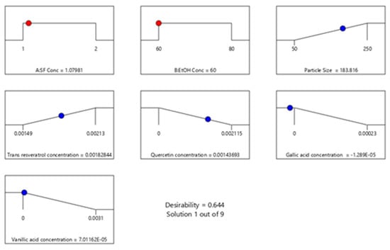 The optimization for the minimum average particle size and maximum encapsulated trans-resveratrol desirability ramp in Figure 7 was done in Std 5. The stated results were obtained as particle size 120 nm and encapsulated trans-resveratrol 0.0024 mg, which is 62% of the encapsulated phenolic compounds.