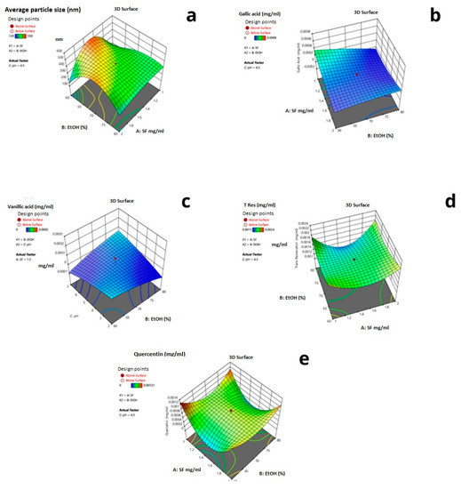 Generally, the larger the magnitude of the F-value and the smaller the p-value, the more significant the effect of the corresponding parameter on the response [41]. As can be observed in Table 5, based on the F-values, the most effective parameter was found to be ethanol concentration for quercetin concentration and average particle size, while for trans-resveratrol, the most effective parameter was silk fibroin concentration.