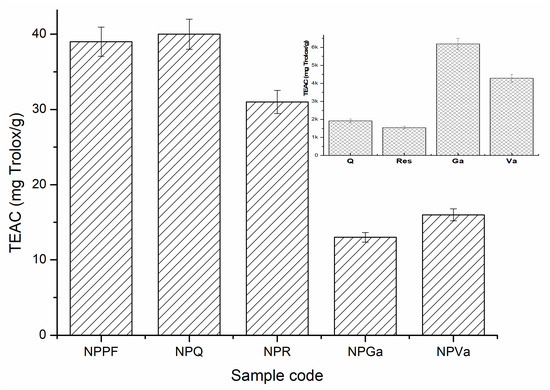 Trolox equivalent antioxidant capacity (TEAC) of encapsulated mix polyphenols (NPPF) and encapsulated polyphenols (NPQ, NPR, NPGA, and NPVa).