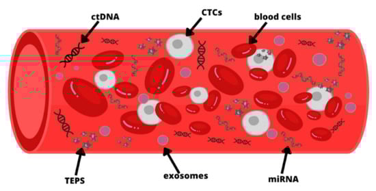 Molecules detected in peripheral blood for liquid biopsy: circulating tumor DNA (ctDNA), circulating tumor cells (CTCs), tumor-educated platelets (TEPS), microRNA (miRNA). The figure is only for illustrative purposes. There is no indication of the actual size of each element.