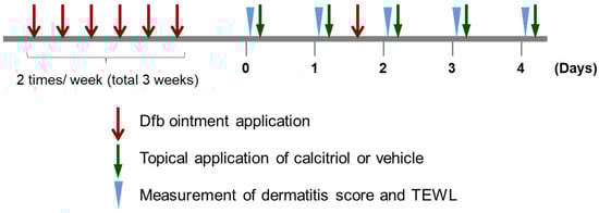 Experimental protocol for induction of the atopic dermatitis model and treatment with calcitriol. Dermatitis was induced in NC/Nga mice aged 8 weeks following a topical application of Dfb ointment twice weekly for 3 weeks. Calcitriol and vehicle were applied once daily for 4 days.