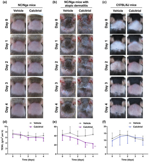 The effects of a daily topical application of calcitriol for 4 days on the condition of the skin in NC/Nga mice without atopic dermatitis, NC/Nga mice with atopic dermatitis, and C57BL/6J mice. (a–c) Representative images of the back skin treated with vehicle (left panels) and 1 nmol calcitriol (right panels) in NC/Nga mice (a), NC/Nga mice with atopic dermatitis (b), and C57BL/6J mice (c). (d–f) TEWL data represent the means ± standard deviations (SDs) for the back skin of NC/Nga mice without atopic dermatitis ((d), n = 10), NC/Nga mice with atopic dermatitis ((e), n = 9), and C57BL/6J mice ((f), n = 5). * p < 0.05 and ** p < 0.01 compared with the vehicle group at each time point using two-way ANOVA with Sidak’s multiple comparison test.