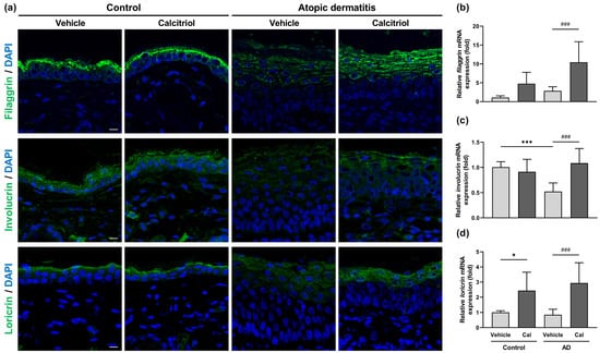 The expression of skin barrier-related proteins is decreased in NC/Nga mice with atopic dermatitis [31,32]. Because calcitriol alleviated skin barrier dysfunction, the epidermal expression of skin barrier-related proteins was examined by immunohistochemistry. The expression of filaggrin, involucrin, and loricrin was decreased in the epidermis of NC/Nga mice with atopic dermatitis. Importantly, calcitriol application increased the downregulated expression of these proteins in mice with atopic dermatitis (Figure 4a). At the mRNA expression level, we observed that only involucrin was markedly downregulated in NC/Nga mice with atopic dermatitis compared to the control group, and its expression was significantly restored by calcitriol application (Figure 3c). In NC/Nga mice with atopic dermatitis, calcitriol also substantially enhanced the mRNA expression of both filaggrin and loricrin (Figure 4b,d). In normal control mice, calcitriol significantly elevated loricrin expression and tended to increase filaggrin expression (Figure 4b,d).