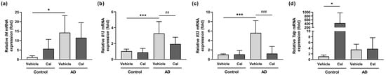 Effects of calcitriol on the expression of type 2 inflammatory mediators in NC/Nga mice. The mRNA expression was analyzed by quantitative real-time PCR on Day 4 in the dorsal skin of vehicle-treated NC/Nga mice (control–vehicle), calcitriol-treated NC/Nga mice without atopic dermatitis (control–Cal), vehicle-treated mice with atopic dermatitis (AD–vehicle), and calcitriol-treated NC/Nga mice with atopic dermatitis (AD–Cal). The mRNA levels of Il4 (a), Il13 (b), Il33 (c), and Tslp (d) were quantified. The data represent the mean ± SD in each group (n = 4–8). * p < 0.05 and *** p < 0.001 compared with the control–vehicle group; ## p < 0.01 and ### p < 0.001 compared between the AD–vehicle and AD–Cal groups by one-way ANOVA with Tukey’s multiple comparison test.