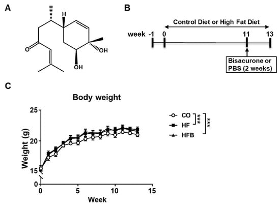 (A) The structural formula of bisacurone. (B) Treatment schedule of bisacurone. After adaptation for one week, BALB/c mice received a control diet or a high-fat diet for eleven weeks. HFD-fed mice were orally administered with bisacurone in PBS (HFB group), or PBS only (HF group) every day for two weeks. Control diet-fed mice were orally administered with PBS (CO group). (C) The influence of bisacurone on body weight in HFD-fed mice. Data represent the mean ± SEM of two independent experiments. *** p < 0.001, two-way ANOVA, Tukey’s multiple comparisons test.