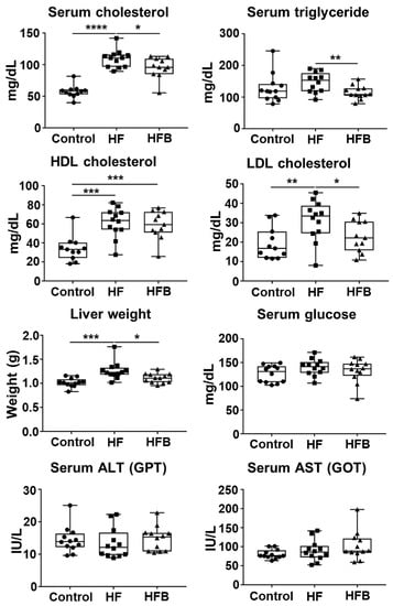 The influence of bisacurone on the serum levels of biochemical parameters in HFD-fed mice. BALB/c mice (n = 6/group) received an HFD or a control diet. HFD-fed mice were orally administered with bisacurone in PBS or PBS only. Control diet-fed mice received oral administration of PBS. The weight of livers and the levels of total, LDL, HDL cholesterols, triglyceride, glucose, aspartate aminotransferase (AST), and alanine aminotransferase (ALT) in sera from the mice were measured. Data represent the mean ± SEM of two independent experiments. Each symbol indicates an individual mouse. Control: Control diet-fed and PBS-treated group. HF: HFD-fed and PBS-treated group. HFB: HFD-fed and bisacurone-treated group. * p < 0.05, ** p < 0.01, *** p < 0.001, **** p < 0.0001, student’s t-test.