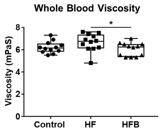 The influence of bisacurone on the blood viscosity of HFD-fed mice. BALB/c mice (n = 6/group) received an HFD or a control diet. HFD-fed mice were orally administered with bisacurone in PBS, or PBS only. Control diet-fed mice were orally administered with PBS. The viscosity of blood samples harvested from the mice was measured using an ultra-micro viscometer. Each symbol indicates an individual mouse. Data represent the mean ± SEM of two independent experiments. Control: Control diet-fed and PBS-treated group. HF: HFD-fed and PBS-treated group. HFB: HFD-fed and bisacurone-treated group. * p < 0.05, student’s t-test.