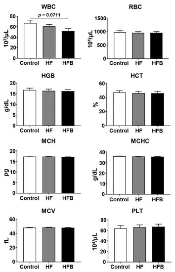 The influence of bisacurone on hematological parameters in HFD-fed mice. BALB/c mice (n = 10) received an HFD or a control diet. HFD-fed mice were orally administered with bisacurone in PBS or only PBS. Control diet-fed mice were orally administered with PBS. Blood was harvested from mice, and hematological parameters were measured. Data represent the Mean ± SEM, student’s t-test. WBC: White blood cell count; RBC: Red blood cell count; HGB: Hemoglobin; HCT: Hematocrit; MCV: Mean corpuscular volume; MCH: Mean corpuscular hemoglobin; MCHC: Mean corpuscular hemoglobin concentration; PLT: Platelet count. Control: Control diet-fed and PBS-treated group. HF: HFD-fed and PBS-treated group. HFB: HFD-fed and bisacurone-treated group.