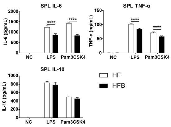 The influence of bisacurone on the production of pro-inflammatory cytokines in spleens of HFD-fed mice. The splenocytes were prepared at 2 × 106 cells/mL (n = 6) and stimulated with LPS (1 µg/mL) or Pam3CSK4 (5 µg/mL) for 24 h. The concentrations of IL-6, TNF-α, IL-1β and IL-10 in the culture supernatants were measured by ELISA. Data represent the mean ± SEM of two independent experiments. HF: HFD-fed and PBS-treated group. HFB: HFD-fed and bisacurone-treated group. **** p < 0.0001, student’s t-test.