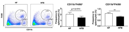 The influence of bisacurone on the frequency of splenocytes in HFD-fed mice. The frequency of macrophages in spleens of bisacurone-treated or non-treated mice (n = 6) on HFD was measured by FACS. Representative dot blot data (left) of CD11b and F4/80 expressing cells in the spleens and the frequency of splenocytes (right) expressing CD11b and/or F4/80 were shown. Data represent the mean ± SEM of two independent experiments. HF: HFD-fed and PBS-treated group. HFB: HFD-fed and bisacurone-treated group. ** p < 0.01, student’s t-test.