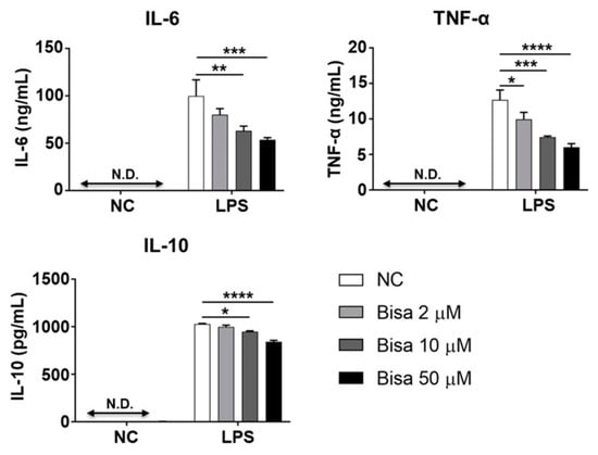 The influence of bisacurone on cytokine production in a murine macrophage line. RAW264.7 cells were prepared at 1 × 106 cells/mL (n = 3) and treated with 2, 10, or 50 μM bisacurone and stimulated with 10 ng/mL of LPS for 24 h. The concentrations of IL-6, TNF-α, and IL-10 in the culture supernatants were measured by ELISA. Data shows the mean ± SEM and represent three independent experiments. * p < 0.05, ** p < 0.01, *** p < 0.001, **** p < 0.0001. Ordinary one-way ANOVA, Tukey’s multiple comparisons test. Bisa: Bisacurone. N.D.: not detectable.