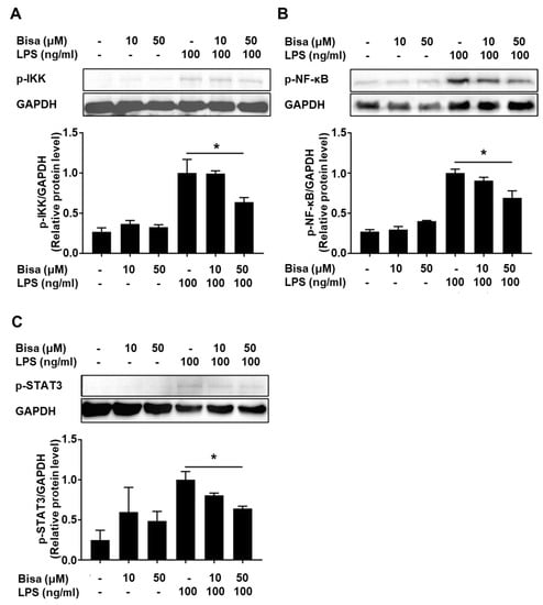The influence of bisacurone on activation of NF-κB cascade and STAT3 in a murine macrophage strain. RAW264.7 cells were treated with 10 or 50 μM bisacurone and stimulated with 100 ng/mL of LPS for 30 min or 6 h. Phosphorylation of (A) IKKα/β, (B) NF-κB p65 subunit and (C) STAT3, together with GAPDH, in the cells were detected by western blotting. Data represent the mean ± SEM of three independent experiments. * p < 0.05. Ordinary one-way ANOVA, Tukey’s multiple comparisons test. Bisa: Bisacurone.