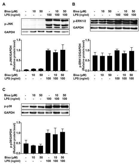 The influence of bisacurone on activation of MAP kinases in a murine macrophage strain. RAW264.7 cells were treated with 10 or 50 μM bisacurone and stimulated with 100 ng/mL of LPS for 30 min. (A) Phosphorylated JNK, (B) ERK1/2, and (C) p38 kinase in the cells, together with GAPDH, was detected by western blotting. Data represent the mean ± SEM of three independent experiments. Ordinary one-way ANOVA, Tukey’s multiple comparisons test. Bisa: Bisacurone.