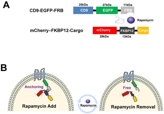 Research into using EVs as delivery vehicles for therapeutic cargo is rapidly increasing. In this study, we developed a delivery system that transfers specific cargo to EVs using a well-known PPI induced by small compounds based on comparable reports published in recent years [40,41]. We utilized biologically essential characteristics, i.e., FKBP 12 and the FRB domain of mTOR forms a heterodimer in the presence of rapamycin or its analog [42,43]. We generated a rapamycin-induced interaction system between FKBP12 and the FRB domain of mTOR. In this study, we made one construct encoding CD9, a typical EV marker, fused with EGFP-FRB and produced another construct encoding that specific cargo fused with mCherry-FKBP12 (Figure 1A). The CD9 conjugated with EGFP-FRB is recruited to the exosomal membrane and anchors the specific cargo containing mCherry-FKBP12 in the exosomes via the FKBP12 and FRB interaction in the presence of rapamycin. While CD9 connected with EGFP-FRB, protein is dissociated with the specific cargo fused with mCherry-FKBP12 in the absence of rapamycin (Figure 1B). In this study, we proposed that compound-mediated heterodimerization could induce the recruitment of specific cargo to EVs using a typical EV marker protein and PPI system.