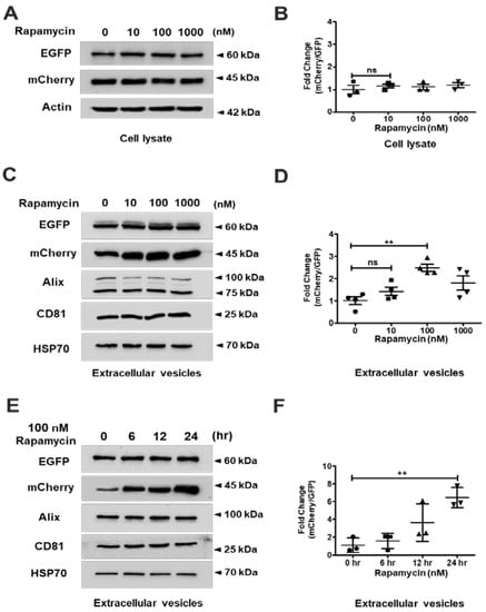 Rapamycin-induced loading of FKBP12-mCherry-Cargo into extracellular vesicles (EVs) containing CD9-EGFP-FRB. All data were analyzed via one-way ANOVA, followed by Turkey’s HSD test. (A) COS-7 cells were transiently transfected with the expression plasmids encoding CD9-EGFP-FRB and mCherry-FKBP12-Cargo. The cells were cultured in complete media for 24 h and then incubated with indicated rapamycin under the serum starvation condition. The expression levels of EGFP and mCherry were confirmed in cell lysates by immunoblot analysis. Actin was used as a loading control. (B) Quantification of panel (A). The quantification was performed with ImageJ. The fold change (ratio of mCherry/EGFP) was calculated between pairs of plasmid expression levels from three independent immunoblot analyses. n = 3, mean ± standard deviation (SD) (ns = not significant). (C) The EVs were isolated according to materials and methods described in the detailed isolation methods of EVs. Several proteins such as Alix, CD81, and HSP70 were enriched in EVs and used as markers. (D) Quantification of panel (C). n = 4, mean ± standard deviation (SD). There are significant differences between the absence or presence of rapamycin treatment groups. (ns = not significant, ** p = 0.0031 for rapamycin) (E) The transfected COS-7 cells were cultured in complete media for 24 h and then incubated with 100 nM rapamycin for different times under the serum starvation condition. The EVs were isolated according to materials and methods. (F) Quantification of panel (E). n = 3, mean ± standard deviation (SD). There are significant differences between 0 h and 24 h in 100 nM rapamycin treatment groups. ** p = 0.0047 for 24 h compared to 0 h. All raw data from immunoblots are in Supplementary Figure S6.