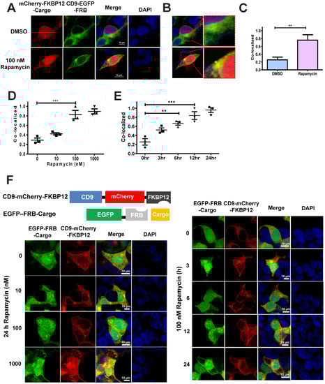 2.2. CD9-EGFR-FRB and mCherry-FKBP12-Cargo Were Co-Localized in EVs by Rapamycin