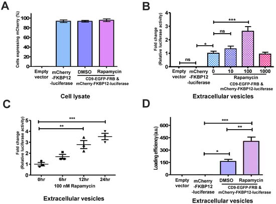 Reporter gene assay for measuring extracellular vesicle (EV)-mediated loading capacity. (A) The HEK-293 cells were transiently transfected with indicated plasmids. The percentage of cells expressing mCherry were counted from cell lysates after the incubation of the absence or presence of rapamycin. The data were analyzed as the mean ± standard deviation (SD) (n = 3). (B) The EVs were isolated from these transfected HEK-293 cells after incubation in the absence or presence of rapamycin. The luciferase activity was evaluated by measuring the luminescence signals of the EVs released from transfected HEK-293 cells. Mean ± standard deviation (SD) (n = 3). There were significant differences between their groups (ns = not significant, * p < 0.05, *** p < 0.0001). (C) The EVs were isolated from HEK-293 cells transfected with CD9-EGFP-FRB and mCherry-FKBP12-luciferase in the absence or the presence of rapamycin (100 nM) for the indicated time point. The data were analyzed as the mean ± standard deviation (SD) (n = 3) followed by Turkey’s HSD test (** p < 0.01, *** p = 0.0007). (D) The loading efficiency of luciferase in the EVs released from HEK-293 cells transfected with indicated plasmids. This value was calculated by dividing the number of luciferase molecules in EVs by the number of luciferase molecules in the transfected HEK-293 cells. The number of luciferase molecules was estimated from a standard curve using recombinant luciferase. The data were analyzed as the mean ± standard deviation (SD) (n = 3) followed by Turkey’s HSD test (* p < 0.05, ** p < 0.01, *** p < 0.0001).