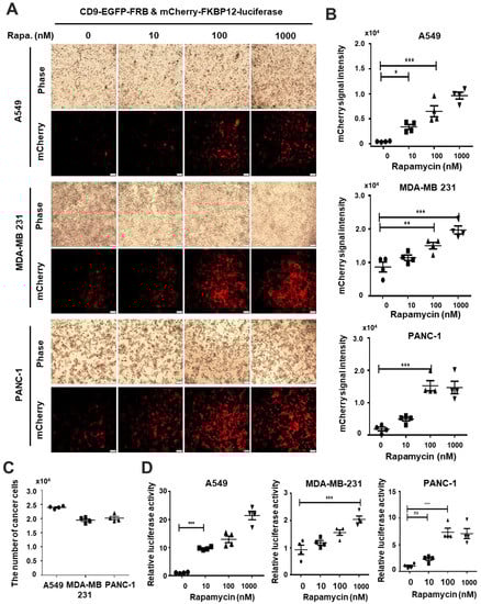 Ultimately, we examined whether the chemical-induced delivery system might be used as a functional delivery system that can used in the context of refractory cancer cells, such as those of non-small cell lung cancer, triple-negative breast cancer, and pancreatic cancer. First, we selected the representative refractory cancer cell line for the delivery assay. We utilized the A549, MDA-MB231, and Panc-1 as non-small cell lung cancer, triple-negative breast cancer, and pancreatic cancer cells, respectively. We treated with rapamycin at diverse concentrations (0, 10, 100, and 1000 nM) in HEK-293 cells transfected with two plasmids encoding CD9-EGFP-FRB and mCherry-FKBP12-luciferase. We isolated and purified EVs secreted from serum-free media, and then treated the EVs in refractory cancer cell lines. The signals of red fluorescence were transferred to EVs via interaction of FRB with FKBP12 by rapamycin. Their signals increased in a rapamycin-dose-dependent manner in A549, MDA-MB231, and Panc-1 cells, indicating that the EVs secreted from donor cells were delivered to refractory cancer cells (Figure 5A,B). The phase contrast images showing cell morphology of refractory cancer cells treated with EVs were unaffected in a rapamycin-dose-dependent manner (Figure 5A). We confirmed the equal number of refractory cancer cells used in this study (Figure 5C). Finally, we measured the luciferase activity from refractory cancer cells to compare the signal difference between them and red fluorescence. The luciferase activity was increased as rapamycin dosage was increased (Figure 5D). We observed a few differences between luciferase activity and red fluorescence. These results suggested that EVs containing a potential drug have the potential to be utilized as a delivery system into recipient refractory cancer cells.