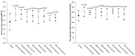 The heterogeneity of the monocytes’ complexity was also found to be consistently increased in all samples spiked with the two concentrations of the four SARS-CoV-2 recombinant spike protein variants, achieving statistical significance in samples containing Alpha and Delta 20 ng/mL recombinant spike proteins (Figure 1).