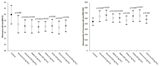 The values of MO-WZ, reflecting the heterogeneity of the monocyte volumes, were found to be increased in all samples, achieving statistical significance in those where the SARS-CoV-2 recombinant spike proteins of the Ancestral, Alpha, and Delta variants were added at the higher 20 ng/mL final concentration (Figure 3).