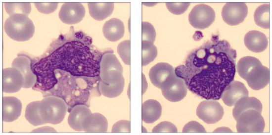Briefly, the cells were found to be largely dysmorphic, granulated, and intensely vacuolated, with an aberrant nucleus and clear alterations in chromatin structure, as well as presenting cytoplasmic extrusions. Platelet phagocytosis could also be clearly observed.